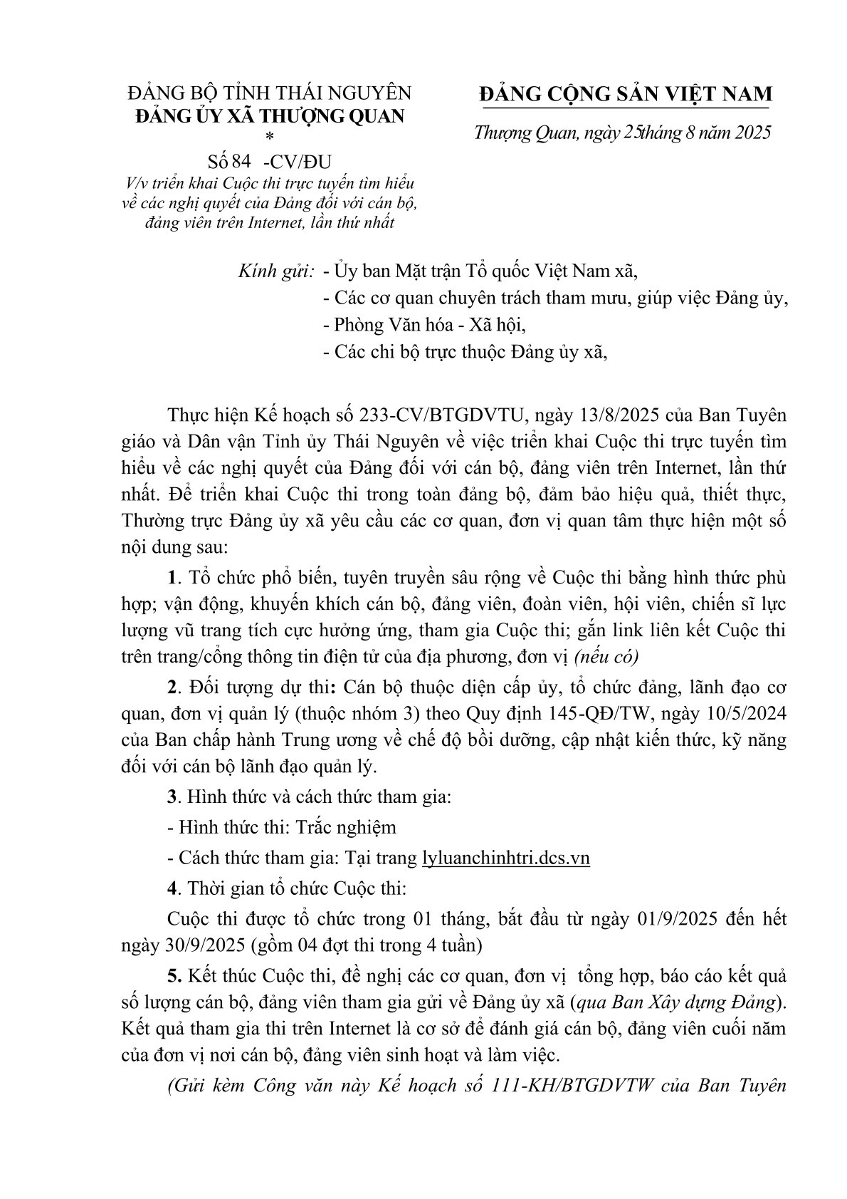 Ngày 25/8/2025, UBND xã Thượng Quan ban hành Công văn số 611/UBND-KT yêu cầu các thành viên BCH phòng chống thiên tai và tìm kiếm cứu nạn xã; các phòng, ban, cơ quan khối UBMTTQ xã; Công an xã; Ban CHQS xã, các Trưởng thôn tập trung triên khai ứng phó với cơn Bão số 5 (KAJIKI).