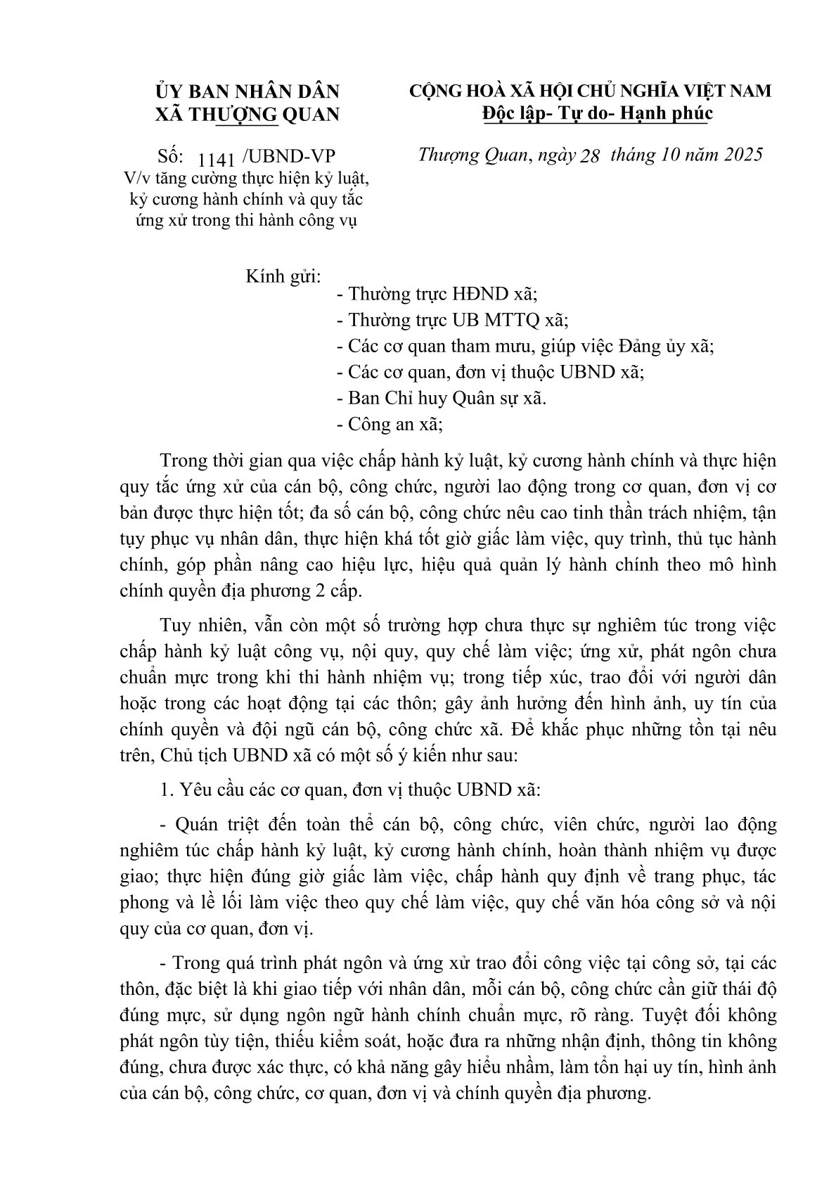 Ngày 28/10/2025, UBND xã Thượng Quan ban hành Công văn số 1141/UBND-VP về việc tăng cường thực hiện kỷ luật, kỷ cương hành chính và quy tắc ứng xử trong thi hành công vụ.